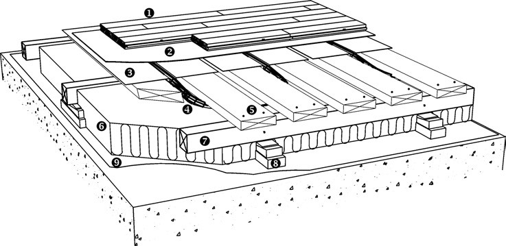 1. Массивна доска или паркет толщиной: 20.5 или 22 мм (крепление т- гвоздями) 2. Целюлозо-войлочная мембрана Junckers 500 г/м.кв. 3. Стропилы 4. Металические теплораспределительные панели 5. Трубы обогрева 6. Обрешотка из обрезной доски 25х100 мм 7. Поперечные планки 8. Крепление поперечных планок 9. Потолок с изоляционным материалом |