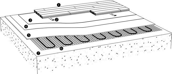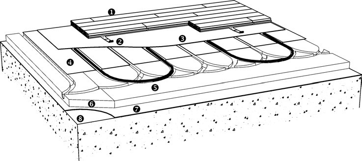 1. Массивна доска или паркет толщиной: 14, 15, 20.5 или 22 мм 2. Скобы 3. Подложка Polyfilt 1.5 мм 4. Влагозащитная пленка 0.20 мм 5. Бетонная стяжка 6. Трубы обогрева 7. Арматурная сетка 8. Изоляционный слой 9. Межэтажное перекрытие |