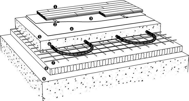 1. Массивна доска или паркет толщиной: 14, 15, 20.5 или 22 мм 2. Скобы 3. Подложка Polyfilt 1.5 мм 4. Влагозащитная пленка 0.20 мм 5. Бетонная стяжка 6. Трубы обогрева 7. Арматурная сетка 8. Изоляционный слой 9. Межэтажное перекрытие |