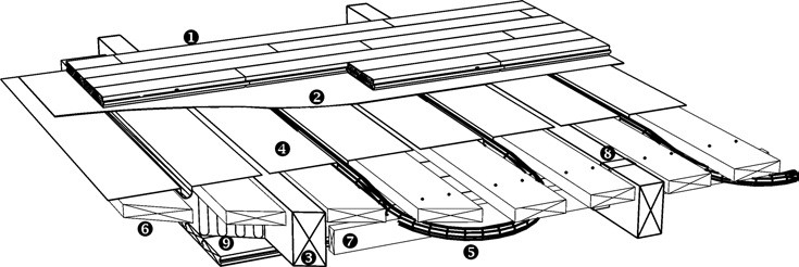 1. Массивна доска или паркет толщиной: 20.5 или 22 мм (крепление т- гвоздями) 2. Целюлозо-войлочная мембрана Junckers 500 г/м.кв. 3. Стропилы 4. Металические теплораспределительные панели 5. Трубы обогрева 6. Обрешотка из обрезной доски 25х100 мм 7. Поперечные планки 8. Крепление поперечных планок 9. Потолок с изоляционным материалом |